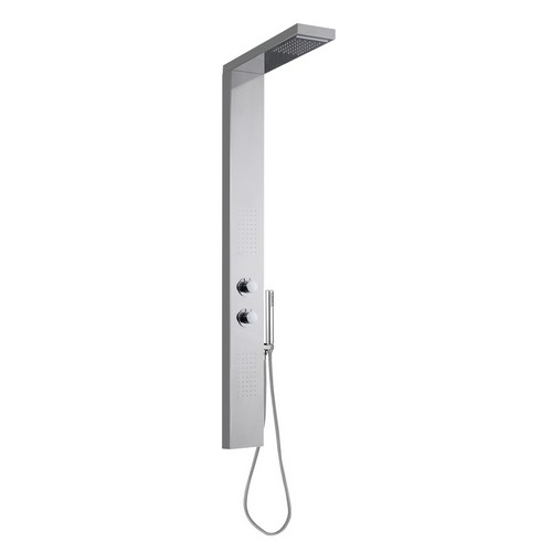 11304 Set colonna mezzo totem 1500x150x75 – 570x150x35 mm in inox cromato con miscelatore progressivo e deviatore incorporati, completa di soffione con funzione cascata e getti frontali, doccia Link ABS cromato tonda anticalcare 1 getto e flessibile antitorsione 150 cm Satilux