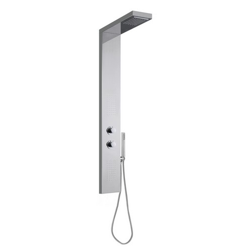 11307 Set colonna mezzo totem 1400x200x43 – 500x200x35 mm in inox cromato con miscelatore meccanico progressivo e deviatore incorporati, con soffione con funzione cascata e getti frontali, doccia Link, flessibile