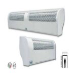 La gamma di barriere d’aria tangenziali tecnosystemi s.P.A. Comprende 8 modelli che possono funzionare sia ad aria calda che a temperatura ambiente. La produzione di un getto d’aria calda è resa possibile dall’installazione, all’interno della barriera, di una resistenza elettrica che riscalda l’aria. Tutti i modelli sono dotati di telecomando che regola l’accensione/spegnimento della barriera, le 3 velocità di funzionamento del motore e l’accensione della resistenza elettrica. Il cruscotto a 5 led luminosi, permette inoltre di verificare la funzione selezionata e di agire manualmente sulle regolazioni. Le barriere sono dotate di staffette distanziatrici per aggancio a muro adatte a consentire il regolare flusso verticale del getto d’aria della barriera. Nei modelli con aspirazione superiore la distanza tra l’unità ed il soffitto deve essere almeno di 150 mm.