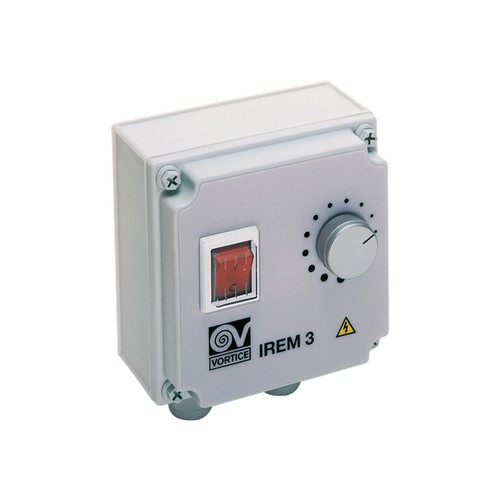 Regolatore elettronico di velocità ad alimentazione monofase (220 – 240 V / 50 Hz) destinato al controllo di motori AC monofase. Colore grigio chiaro. Carico massimo ammissibile: 3 A. Involucro per installazione a parete caratterizzato da protezione IP54. Potenziometro integrato.