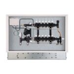 Centralina di distribuzione per circuiti a bassa temperatura costituita da: collettori specifici, pompa di circolazione, collettore di miscelazione, comprensivo di valvola di non ritorno, e gruppo di regolazione ritorno, regolazione a valore fisso mediante valvola ad iniezione con testina termostatica a sonda interna (mandata bassa temperatura), termostato di sicurezza a pozzetto, il tutto alloggiato in cassetta metallica da incasso con sportello di chiusura. Comprensiva di: flussometri di regolazione in mandata, termometro di mandata e ritorno, valvole termostatizzabili in ritorno, n°1 valvola automatica di sfogo aria / degasatore, gruppo by-pass regolabile dotato di attacchi per uso riempimento impianto.
