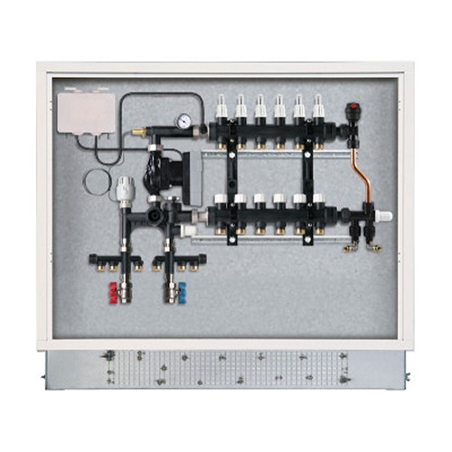 Centralina di distribuzione per circuiti a bassa ed alta temperatura costituita da: collettori specifici, pompa di circolazione, collettore di miscelazione, comprensivo di valvola di non ritorno, e gruppo di regolazione ritorno, regolazione a valore fisso mediante valvola ad iniezione con testina termostatica a sonda interna (mandata bassa temperatura), termostato di sicurezza a pozzetto, il tutto alloggiato in cassetta metallica da incasso con sportello di chiusura. Comprensiva di: flussometri di regolazione in mandata, termometro di mandata e ritorno, valvole termostatizzabili in ritorno, n°1 valvola automatica di sfogo aria / degasatore, gruppo by-pass regolabile dotato di attacchi per uso riempimento impianto. n°2 valvole a sfera di intercettazione.