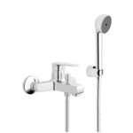 Batteria monocomando per bordo vasca composta da miscelatore monocomando, deviatore automatico, bocca di erogazione e accessorio doccia.