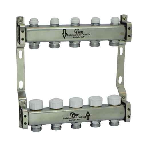 collettore di ritorno con valvole termostatizzabili e cappellotti di regolazione.