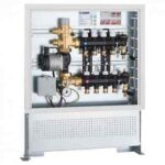Gruppo di regolazione a punto fisso preassemblato. Completo di: – gruppo di regolazione a punto fisso termostatico, – collettori pannelli in materiale composito con flussometri e valvole di intercettazione incorporate, – termostato di sicurezza. Pmax d’esercizio: 6 bar. Campo di temperatura di regolazione: 25÷55°C. Alimentazione: 230 V – 50 Hz. In sede d’ordine completare il codice aggiungendo A2L nel caso di pompa di Classe A, ALPHA2 L 25-60. Esempio codifica: 1825C5A2L 1825D5 A2L 3/4 M DERIVAZIONI x 4