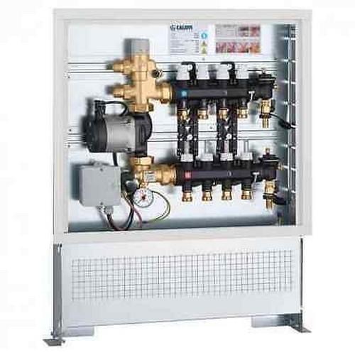 Gruppo di regolazione a punto fisso preassemblato in cassetta. Completo di: – gruppo di regolazione a punto fisso termostatico, – collettori pannelli in materiale composito con flussometri e valvole di intercettazione incorporate, – termostato di sicurezza, – cassetta completa di sostegni a pavimento. Pmax d’esercizio: 6 bar. Campo di temperatura di regolazione: 25÷55°C. Alimentazione: 230 V – 50 Hz. In sede d’ordine completare il codice aggiungendo A2L nel caso di pompa di Classe A, ALPHA2 L 25-60. Esempio codifica: 1825C1A2L 1825F1 A2L 3/4 M DERIVAZIONI x 6