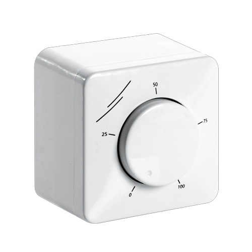 Potenziometro da parete per la regolazione remota della velocità di uno o entrambi i ventilatori dei recuperatori di calore serie VORT NRG EC e VORT NRG ECR privi di gruppi comandi. Colore bianco. Alimentazione monofase 230 V / 50 Hz. Grado di protezione: IP54.