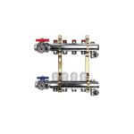 Collettore di distribuzione premontato composto da: collettore di mandata con detentori micrometrici di regolazione e collettore di ritorno con valvole di intercettazione termostatizzabili, sfoghi aria manuali, valvole di carico/scarico impianto, tappi terminali, valvole a sfera di intercettazione con termometro, supporti di fissaggio.