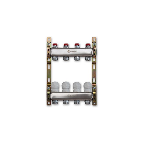 Collettore di distribuzione premontato composto da: collettore di mandata con detentori micrometrici di regolazione, collettore di ritorno con valvole di intercettazione termostatizzabili, supporti di fissaggio.