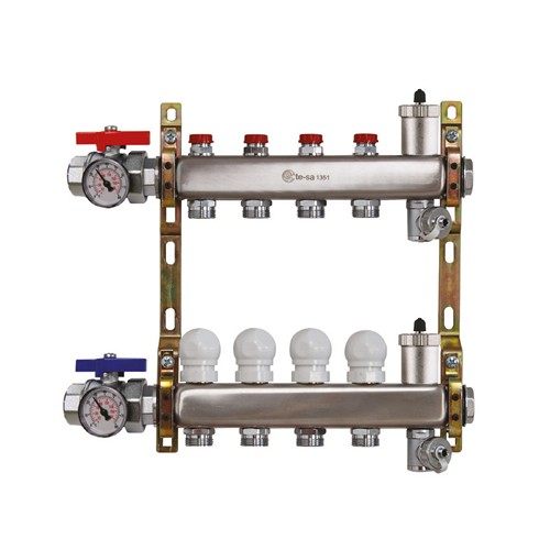 Collettore di distribuzione premontato composto da: collettore di mandata con detentori micrometrici di regolazione e collettore di ritorno con valvole di intercettazione termostatizzabili, sfoghi aria automatici, valvole di carico/scarico impianto, tappi terminali, valvole a sfera di intercettazione con termometro, supporti di fissaggio.