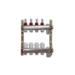 Collettore di distribuzione premontato composto da: collettore di mandata con flussimetri di bilanciamento in tecnopolimero, collettore di ritorno con vitoni regolatori di flusso dinamici termostatizzabili e di intercettazione, sfoghi aria manuali, valvole di carico/scarico impianto, tappi terminali, supporti di fissaggio.