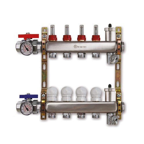 Collettore di distribuzione premontato composto da: collettore di mandata con flussimetri e collettore di ritorno con valvole di intercettazione termostatizzabili, sfoghi aria automatici, valvole di carico/ scarico impianto, tappi terminali, valvole a sfera di intercettazione con termometro, supporti di fissaggio.
