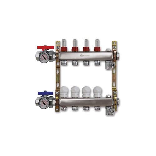 Collettore di distribuzione premontato composto da: collettore di mandata con flussimetri di bilanciamento e collettore di ritorno con valvole di intercettazione termostatizzabili, sfoghi aria manuali, valvole di carico/scarico impianto, tappi terminali, valvole a sfera di intercettazione con termometro, supporti di fissaggio.