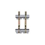 Collettore di distribuzione premontato, composto da: collettori F/F con fori di scarico superiori da 1/2”F, supporti di fissaggio.