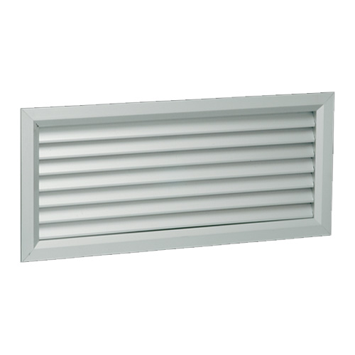 Griglia di ripresa con alette inclinate fisse, passo 25 mm, in alluminio estruso anodizzato naturale, fissaggio a clips. 300×150.
