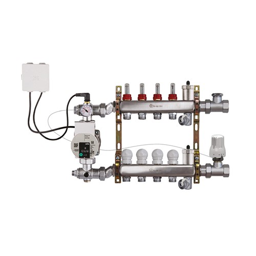 Gruppo premontato per impianti di riscaldamento a pannelli radianti con regolazione a punto fisso, composto da: collettore di mandata in acciaio inox con flussimetri, collettore di ritorno in acciaio inox con valvole di intercettazione termostatizzabili, pompa elettronica in classe energetica A Para 25/7-130 mm, valvole carico/scarico impianto, valvole automatiche di sfogo aria, termostato di sicurezza 65°C. Campo di regolazione 20÷65°C. Alimentazione 230V – 50Hz, supporti di fissaggio. Ingresso primario a destra. Precablato in scatola con morsettiera di collegamento.