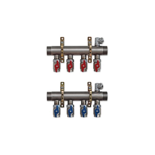 Collettore di distribuzione premontato per impianti a grandi portate composto da: 2 collettori con valvole di intercettazione a sfera, connessioni 3/4”F, valvole di carico/scarico impianto, supporti di fissaggio.