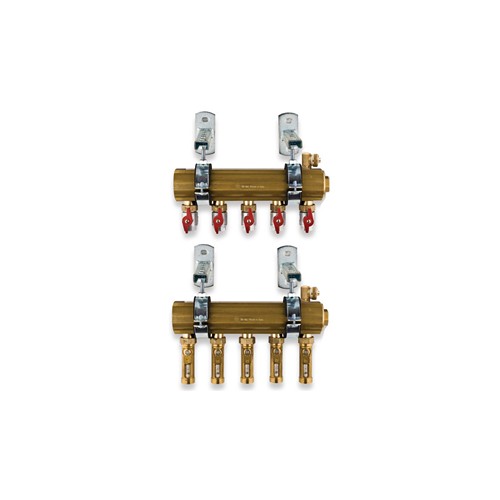 Collettore di distribuzione premontato per impianti a grandi portate composto da: collettore di mandata con valvole di intercettazione a sfera, collettore di ritorno con flussimetri di regolazione con intercettazione, connessioni 3/4”F (mandata) e 1”M (ritorno), valvole di carico/scarico impianto, supporti di fissaggio. Barra da 2” con attacchi di testa 2”F.