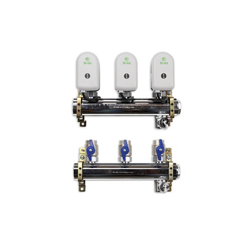 Collettore premontato per centrale termica composto da: collettore di andata con valvole di zona a 2 vie motorizzate, collettore di ritorno con valvole di intercettazione a sfera, rubinetti di carico/scarico impianto, tappi terminali e supporti di fissaggio. Connessioni 3/4”M (mandata) e 3/4”F (ritorno). Interasse derivazioni 100 mm. Barre cromate con attacchi di testa da 1-1/4”F.
