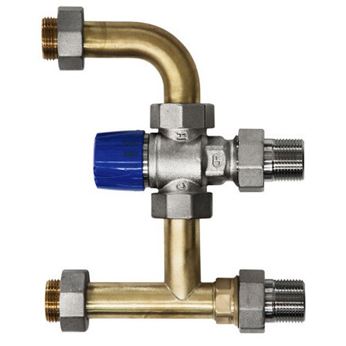 Gruppo costituito da miscelatore termostatico tubazioni e raccordi per l’installazione ed il collegamento a 2 linee sanitarie RBM ACS/AFS da 3/4” o 1”.