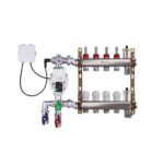Gruppo premontato per impianti di riscaldamento a pannelli radianti con regolazione a punto fisso mediante miscelatore termostatico composto da: collettore di mandata in acciaio inox con flussimetri di bilanciamento, collettore di ritorno in acciaio inox con valvole di intercettazione termostatizzabili, pompa elettronica in classe energetica A Para 25/7-130 mm, valvole carico/scarico impianto, valvole automatiche di sfogo aria, termostato di sicurezza 65°C, termometro di controllo sulla mandata, valvole a sfera di intercettazione sul primario. Campo di regolazione miscelatore 30÷60°C. Alimentazione 230V – 50Hz, supporti di fissaggio. Ingresso primario a sinistra verticale od orizzontale definibile in fase di installazione. Precablato in scatola con morsettiera di collegamento.