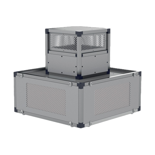 • Involucro con struttura portante in profilati di alluminio estruso, spessore 30 mm, con giunti angolari in nylon; pannelli sandwich di spessore pari a 25 mm in lamiera d’acciaio preverniciata di colore grigio chiaro, RAL 9006, classe M0, con finitura anticorrosione, acusticamente isolati mediante lana di roccia resistente al fuoco (classe A1), densità 90 kg/m3. La facilità di rimozione dei pannelli, senza necessità di utensili, grazie ai sistemi di fissaggio rapido adottati, assicura il rapido accesso ai filtri, semplificando la manutenzione ordinaria.