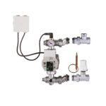 Gruppo di regolazione a punto fisso con attacchi al primario laterali, pompa elettronica in classe energetica A Para 25/7-130 mm, termostato di sicurezza 65°C, detentore di regolazione, valvola termostatizzabile. Alimentazione 230V – 50Hz. Precablato in scatola con morsettiera di collegamento. Bocchettoni eccentrici per il collegamento del collettore