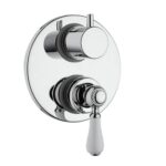 Miscelatore monocomando incasso per doccia con deviatore automatico a 2 uscite, composto da parte grezza e parte esterna di finitura.