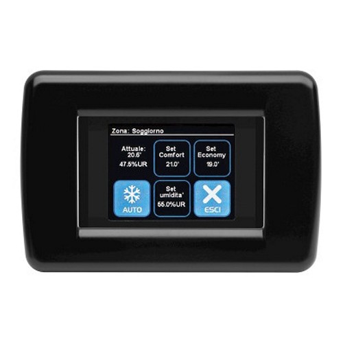 Terminale remoto per l’interfaccia dei regolatori Kilma Set 2, idoneo per l’installazione coordinata con le serie civili da incasso più diffuse.