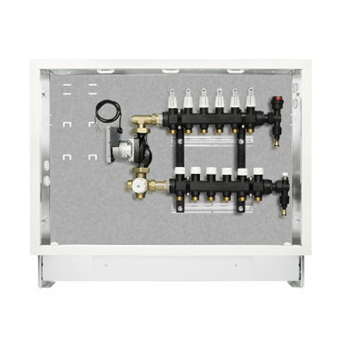 Centralina di distribuzione per circuiti a bassa temperatura costituita da: collettori specifici, pompa di circolazione, miscelatore termostatico, il tutto alloggiato in cassetta metallica da incasso con sportello di chiusura. Comprensiva di: flussometri di regolazione in mandata, valvole termostatizzabili in ritorno, n°1 valvola automatica sfogo aria/degasatore, dotata di attacco per uso riempimento impianto e n°1 gruppo manuale scarico aria.