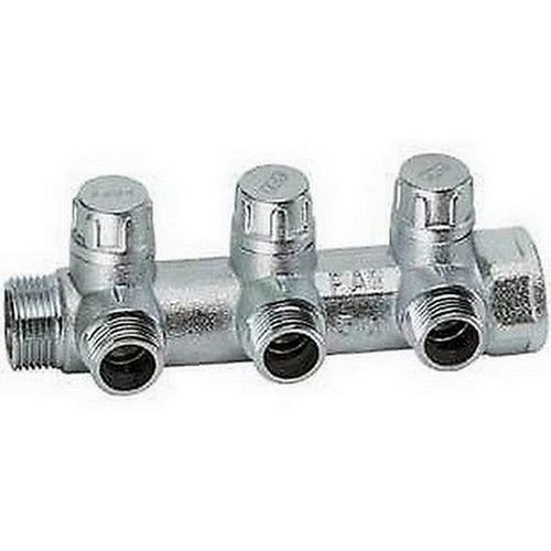 MULTIFAR – Collettore componibile cromato a 3 derivazioni per impianti sanitari o riscaldamento con detentori incorporati per bilanciamento circuiti.