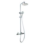 Colonna doccia telescopica con soffione Ø200 mm., regolabile in altezza con interasse fisso, deviatore a parete con flessibile di collegamento e doccia a mano.