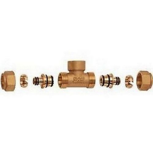 Raccordo a T; femmina con 2 attacchi giallo in ottone stampato.