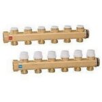 Coppia collettori completi di valvole di intercettazione e detentori di preregolazione portata. Pmax d’esercizio: 10 bar. Campo di temperatura: 5÷100°C. Interasse derivazioni: 50 mm.