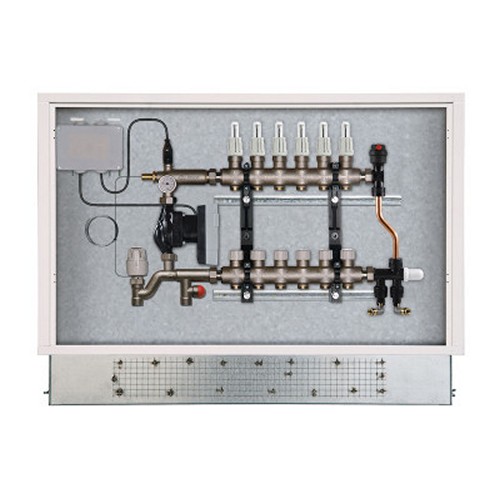 Centralina di distribuzione per circuiti a bassa temperatura costituita da: collettori specifici, pompa di circolazione, collettore di miscelazione, comprensivo di valvola di non ritorno e gruppo di regolazione ritorno; regolazione a valore fisso mediante valvola ad iniezione con testina termostatica a sonda interna (mandata bassa temperatura), termostato di sicurezza a pozzetto, il tutto alloggiato in cassetta metallica da incasso con sportello di chiusura. Comprensiva di: flussometri di regolazione in mandata, termometro di mandata, valvole termostatizzabili in ritorno, n°1 valvola automatica sfogo aria/degasatore, gruppo bypass regolabile dotato di attacchi per uso riempimento impianto.