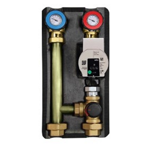 Gruppo di regolazione motorizzabile per centrale termica G1-1/4” completo di valvola miscelatrice a tre vie, pompa elettronica in classe energetica A Para 25/8-180 mm, valvole di intercettazione con termometro incorporato, termostato di sicurezza e coibentazione in PE-X espanso. Tronchetti distanziali in acciaio al carbonio tropicalizzato. Completo di bocchettoni in ottone. Interasse 125 mm.