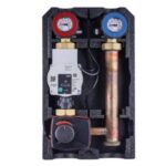 Gruppo di distribuzione con regolazione mediante valvola miscelatrice a tre vie completo di pompa elettronica in classe energetica A serie Para 25/8-180 mm, valvole di intercettazione con termometro incorporato e ritegno sul ritorno, termostato di sicurezza a riarmo automatico, staffa di sostegno a parete con kit di fissaggio, guscio di coibentazione preformato in EPP. Tronchetti distanziali in rame e componentistica in ottone. Interasse 125 mm. Motorizzabile con servomotori serie 730 di tipo a tre punti flottante o con comando proporzionale. Attacchi ingresso 1-1/2”M sede piana ed uscite 1”F. Disponibile nella versione WP senza pompa.