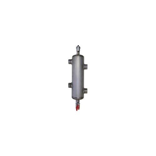 Separatore idraulico per impianti di riscaldamento e raffrescamento completo di valvola di scarico impurità, valvola di sfogo aria automatica con intercettazione. Corpo in acciaio inox. Campo di temperatura 0÷100°C.