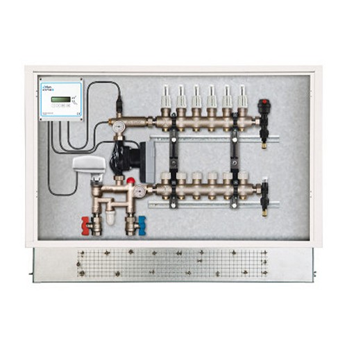 Centralina di distribuzione per circuiti a bassa temperatura costituita da: collettori specifici, pompa di circolazione, by-pass ricircolo caldaia e gruppo di miscelazione integrati insieme; regolazione modulante mediante gruppo di iniezione con servomotore, centralina climatica elettronica, termostato di sicurezza, sonda esterna, sonda interna, (mandata a bassa temperatura) a pozzetto, il tutto alloggiato in cassetta metallica da incasso con sportello di chiusura; Comprensiva di: flussometri di regolazione in mandata, valvole termostatizzabili in ritorno, n°1 valvola automatica sfogo aria/degasatore, dotata di attacco per uso riempimento impianto, n°1 gruppo manuale scarico aria, carico impianto, n°2 valvole a sfera d’intercettazione, termometri lettura temperature mandata ritorno.