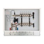 Centralina di distribuzione per circuiti a bassa temperatura costituita da: collettori specifici, pompa di circolazione, by-pass ricircolo caldaia e gruppo di miscelazione integrati insieme; regolazione modulante mediante gruppo di iniezione con servomotore, centralina climatica elettronica, termostato di sicurezza, sonda esterna, sonda interna, (mandata a bassa temperatura) a pozzetto, il tutto alloggiato in cassetta metallica da incasso con sportello di chiusura; Comprensiva di: flussometri di regolazione in mandata, valvole termostatizzabili in ritorno, n°1 valvola automatica sfogo aria/degasatore, dotata di attacco per uso riempimento impianto, n°1 gruppo manuale scarico aria, carico impianto, n°2 valvole a sfera d’intercettazione, termometri lettura temperature mandata ritorno.
