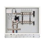 Centralina di distribuzione per circuiti a bassa ed alta temperatura costituita da: collettori specifici, pompa di circolazione e gruppo di miscelazione integrati insieme; regolazione modulante mediante gruppo di iniezione con servomotore, centralina climatica elettronica, termostato di sicurezza, sonda esterna, sonda interna (mandata bassa temperatura) a pozzetto, il tutto alloggiato in cassetta metallica da incasso con sportello di chiusura; Comprensiva di: flussometri di regolazione in mandata valvole termostatizzabili in ritorno, n°1 valvola automatica sfogo aria/degasatore, dotata di attacco per uso riempimento impianto, n°1 gruppo manuale scarico aria, carico impianto, n°2 valvole a sfera d’intercettazione, termometri lettura temperature mandata e ritorno.