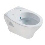 Vaso – bidet sospeso con apertura frontale, in porcellana sanitaria. L’articolo è munito di ugello erogatore per funzione bidet