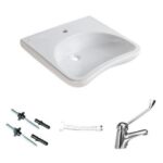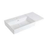 Consolle realizzata in minerale composito, offre un ampia superficie a lato del catino posto in posizione ribassata per il contenimento dell’acqua. La forma, priva di angoli vivi, previene il rischio di traumi. • Installazione sospeso a parete
