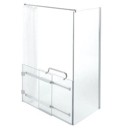 Box doccia con un pannello fisso ed un anta bassa divisa in due metà scorrevoli. Realizzato in vetro di 6 millimetri di spessore e struttura in alluminio brillantato. Completo di asta, tenda in PVC e ganci.