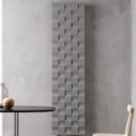 Radiatore a tubi verticali decorato con elementi disposti a scacchiera in lamiera verniciata.