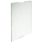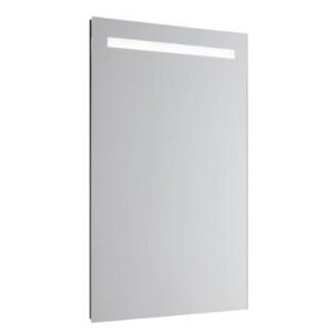 Specchio bagno con telaio in plastica, munito di sistema di illuminazione LED integrato – dietro una sezione sabbiata dello specchio – con interruttore a sfioramento. In vetro – spessore 4 mm. – con angoli arrotondati e spigolo esterno a “filo lucido” tondo. Provvisto di staffa anti-sfilamento dal muro