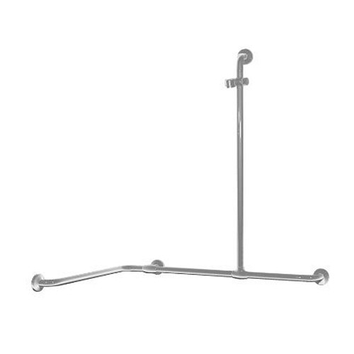 Sostegno di sicurezza per angolo con montante, munito di porta doccetta. Realizzato con tubo di acciaio inox – AISI 304 -, senza saldatura, finito esternamente con smerigliatura meccanica.