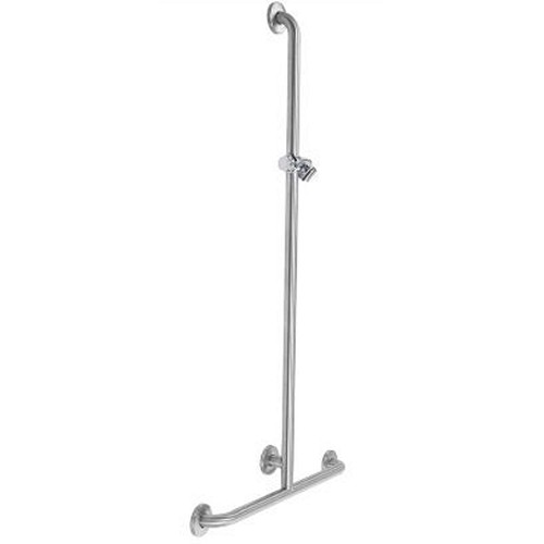 Sostegno di sicurezza a “T”, munito di porta doccetta, realizzato con tubo di acciaio inox – AISI 304 -, senza saldatura, finito esternamente con smerigliatura meccanica.