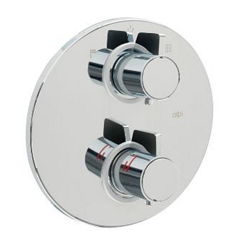 Miscelatore termostatico da incasso, con corpo 2 vie con CAM in ottone e cartuccia deviatrice senza fermo. Piastra esterna, tonda in ottone, senza fissaggi a vista. Manopole in lega di zinco distinte, una per lapertura e una per impostare la temperatura con blocco di sicurezza a 38 gradi. Manopole munite di leve per facilitare la presa.