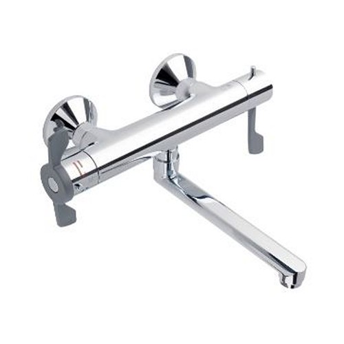 Miscelatore termostatico esterno per installazione a parete, con corpo e bocca di erogazione girevole, realizzati in ottone lucidato e cromato. La maniglia di apertura e la manopola di regolazione della temperatura sono muniti di leve in tecno-polimero morbido